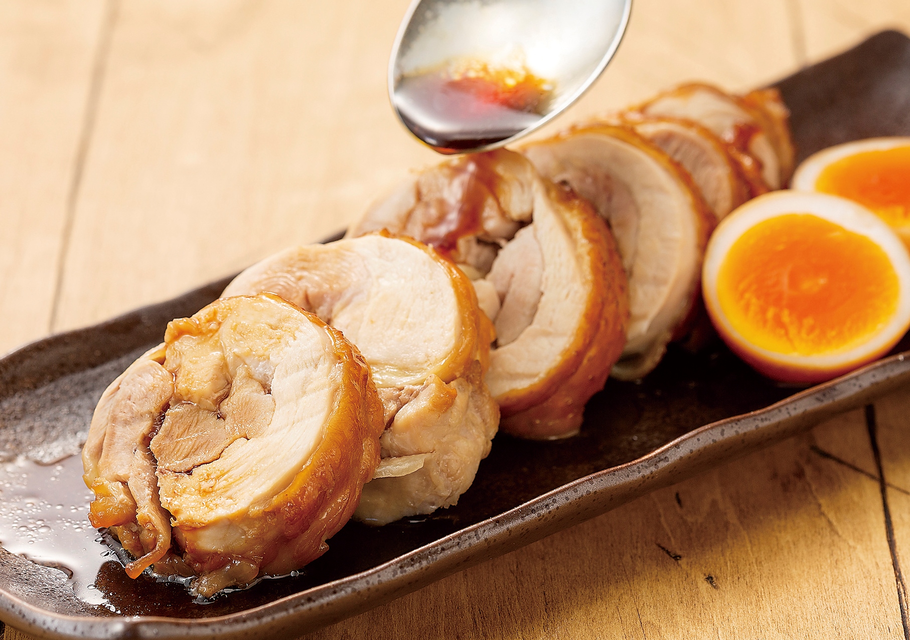 1)を入れ、中火にかける。煮汁が沸騰したら弱火にして、鶏肉を転がしながら約15分煮込み火を止め、そのまま冷ます。
