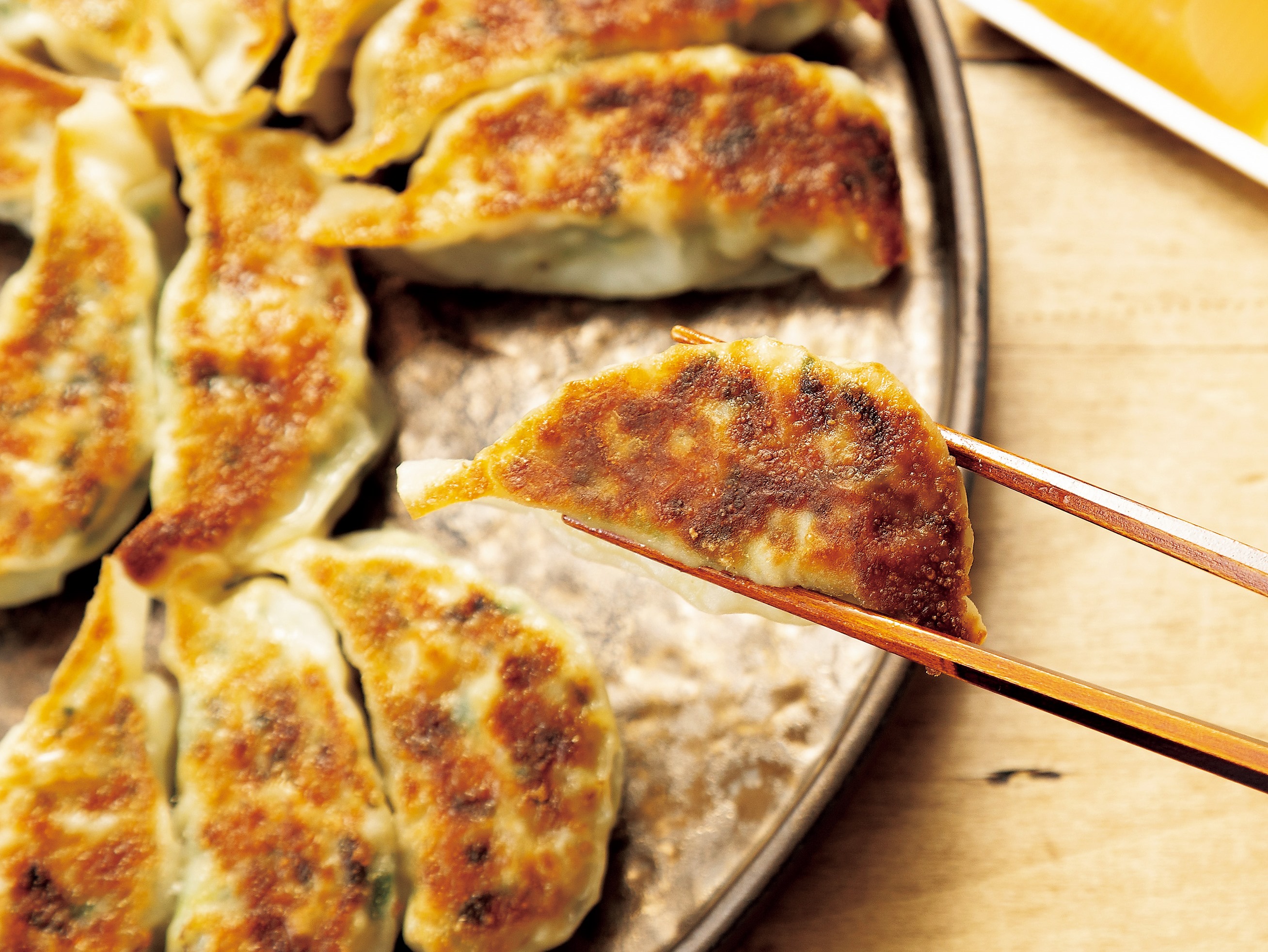 5)フライパンにサラダ油を熱し、4)を並べ中火で焼き、底に焦げ目がついたら水を差し、ふたをして蒸し焼きにする。仕上げにごま油を回しかけ火を止める。