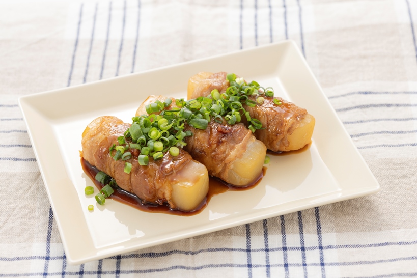 1)こんにゃくは棒状に切り、豚肉を巻く。
