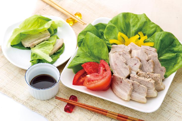 3)粗熱がとれたら1)を5㎜厚さに切り、野菜とともに皿に盛り、たれをつけて食べる。