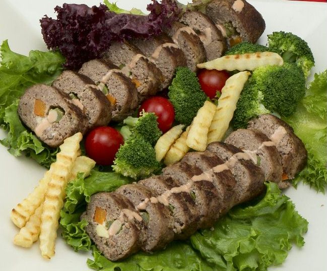 7)切り分けて器に盛り、マヨネーズとケチャップを混ぜたソースをかける。