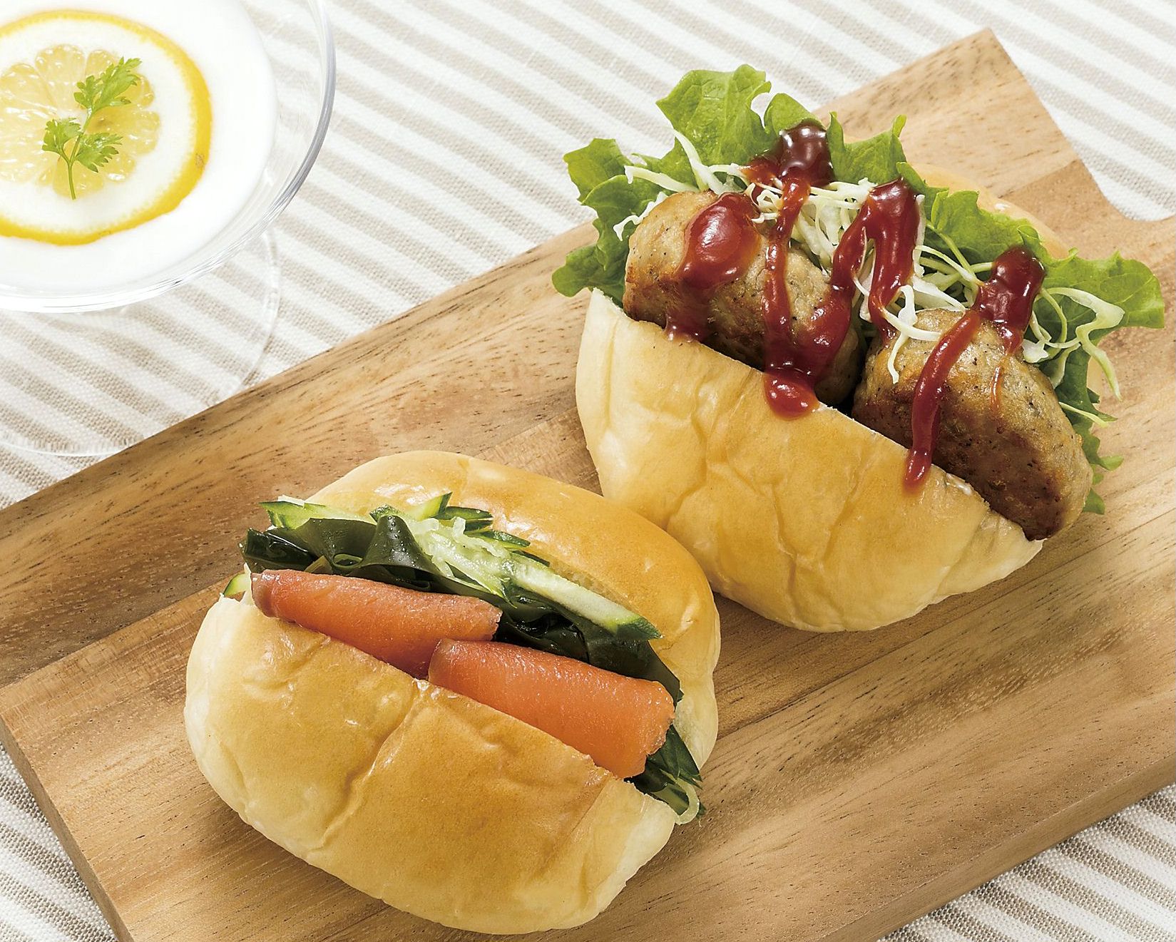 3)B:ミニ焼ハンバーグは電子レンジで温め、厚みを半分に切り、キャベツと一緒に1)にはさみ、ケチャップをかける。