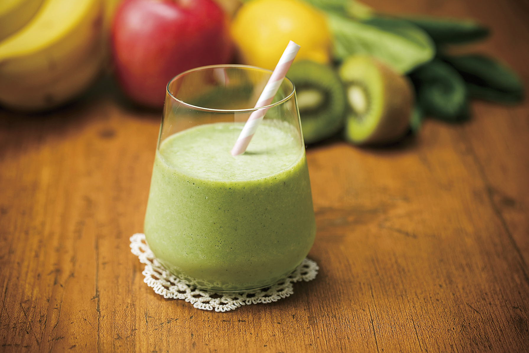 ●材料/2人分 牛乳100㎖、プレーンヨーグルト100g、バナナ(切って冷凍したもの)1本、小松菜80g、はちみつ大さじ1