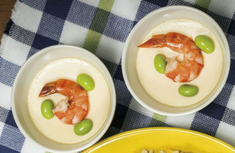 ●作り方 1)卵をしっかり溶きほぐし、牛乳とスープ、塩を加えて混ぜ、ザルで濾す。 2)器に一口大に切ったわかめ、エビ、枝豆を入れ、1)を注ぎ蒸し器で12~15分蒸す。 ●1人分135k㎈