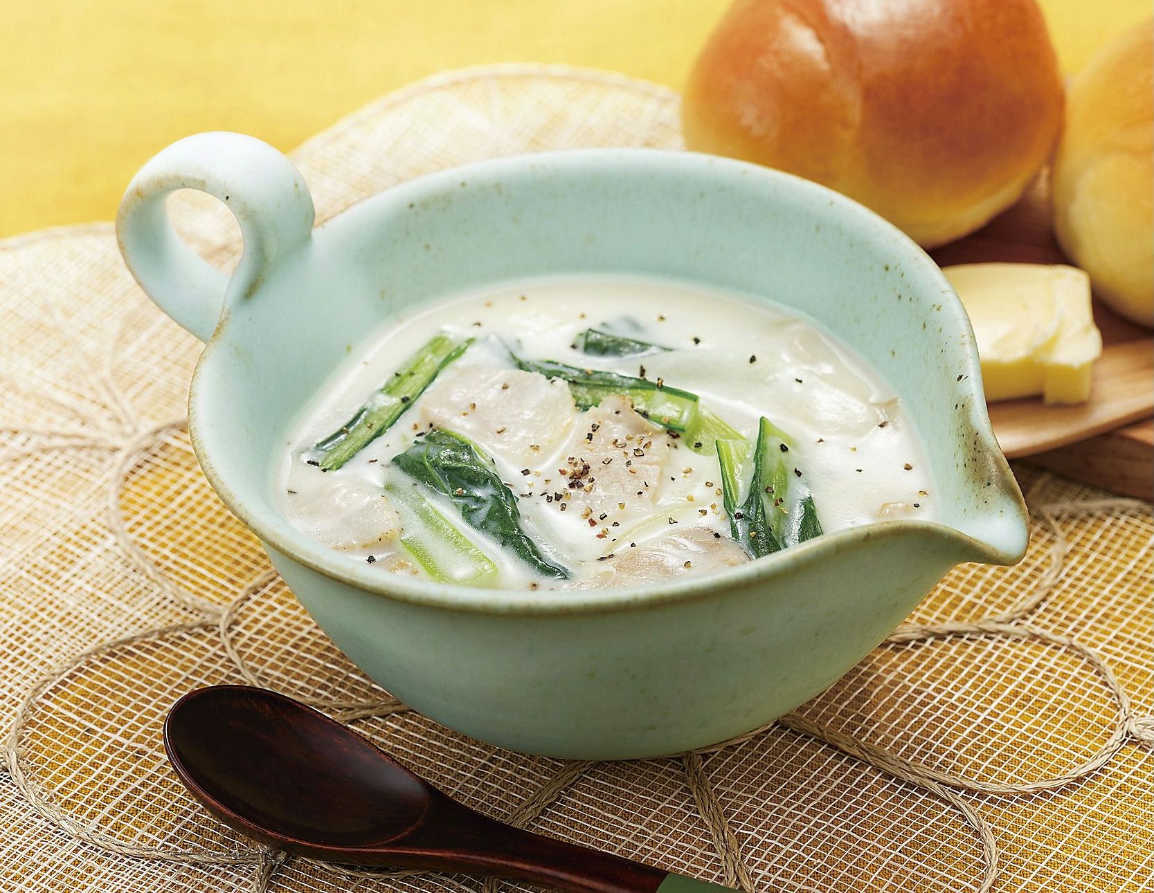 小松菜2株、玉ねぎ1/2個、ベーコン3枚、小麦粉大さじ2、水・牛乳各300cc、固形コンソメ1と1/2個、サラダ油小さじ1