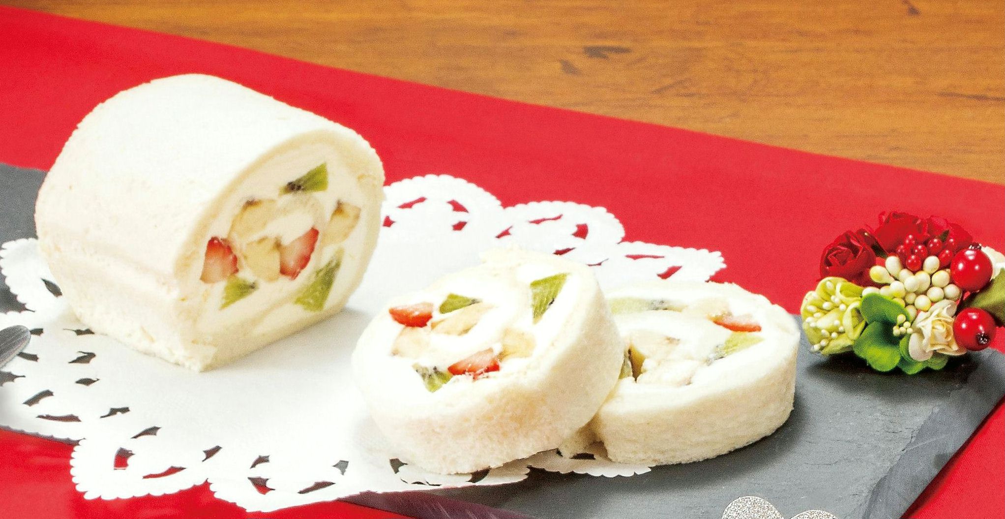 3) キウイとバナナを並べ、いちごを全体に散らし、巻き寿司の要領で巻き、ラップに包む。