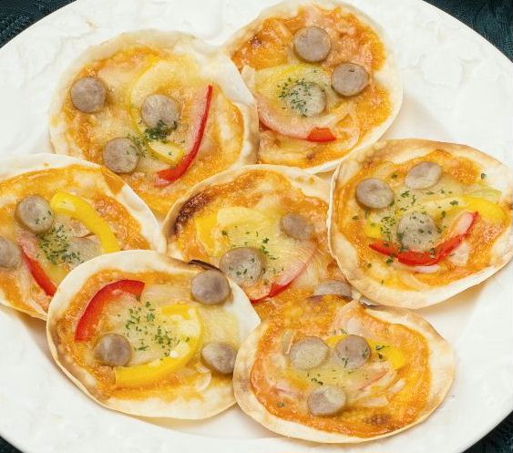 餃子の皮20枚、玉ねぎ1/2個、ウインナー10本、ピザ用チーズ50g、マヨネーズ大さじ2、