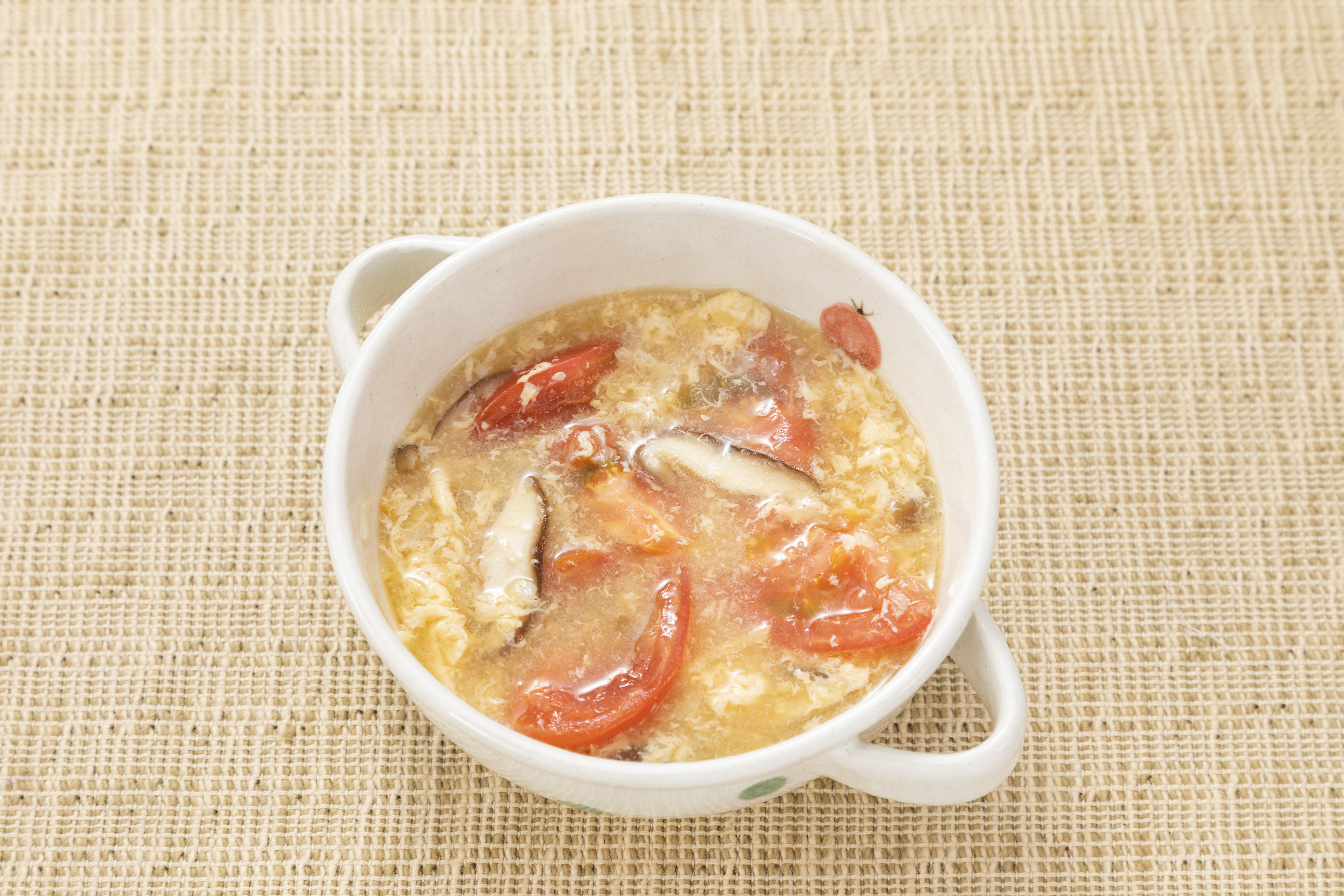 2) トマトとBを加え、沸騰したら溶き卵を流し入れ、再び沸騰したら火を止め、そっと混ぜる。