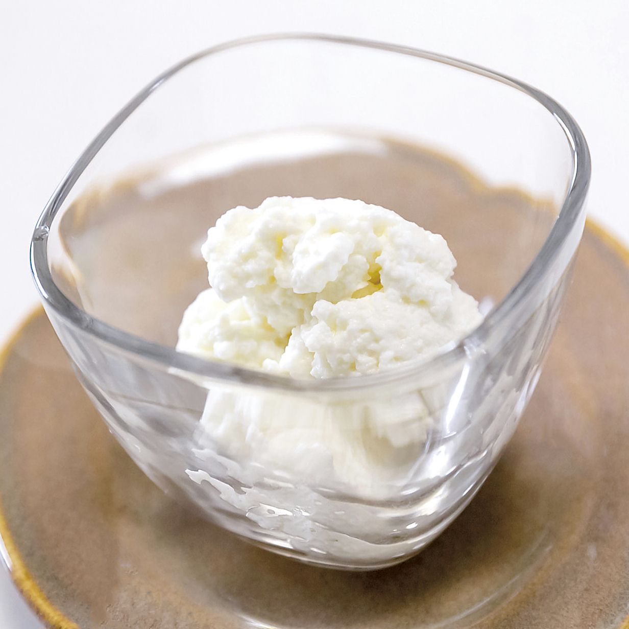 2)ザルにガーゼをしき、ボウルの上に置き、1)を流し入れ水気を切る。水分のしぼり加減で200~300gのカッテージチーズができる(ボウルにたまった水分がホエー)。