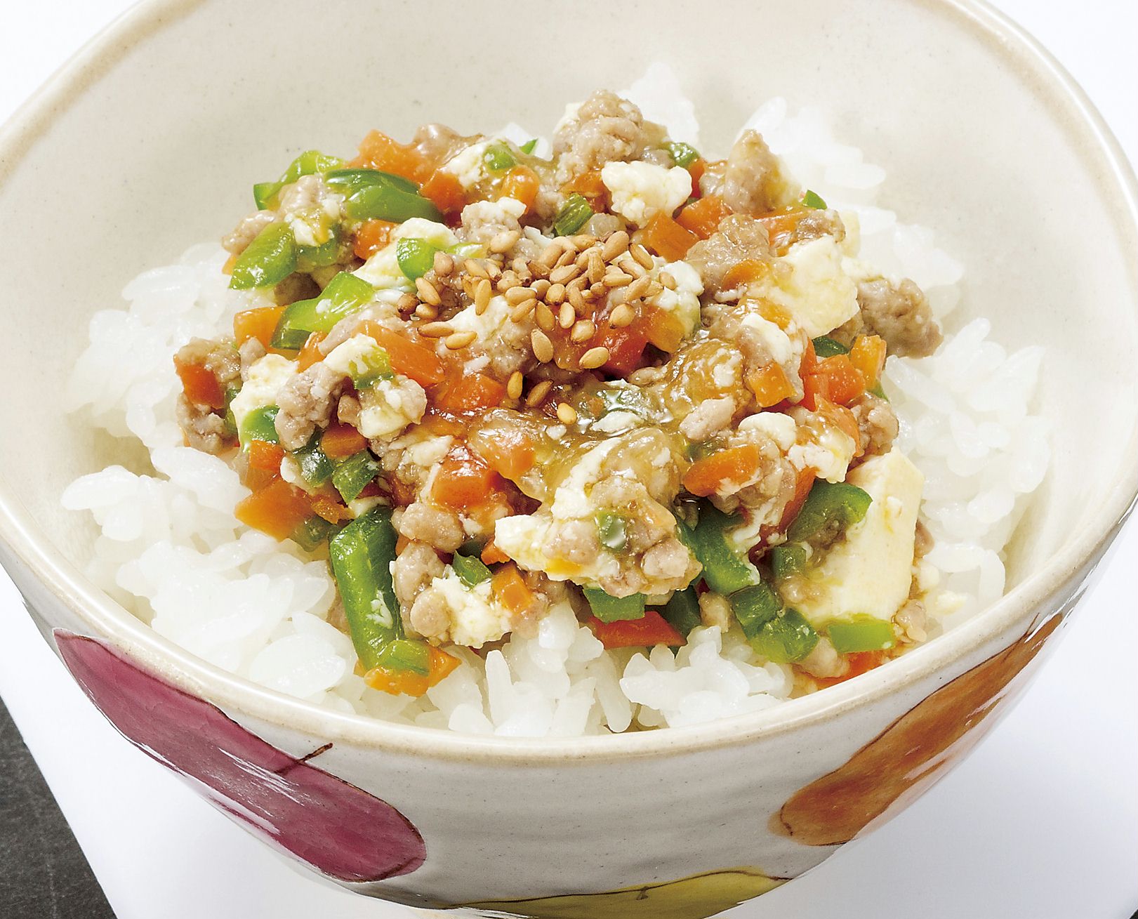 豚ひき肉200g、人参1本、ピーマン4個、もめん豆腐1/2丁、ごま油・白煎りごま・めんつゆ各大さじ2、酒大さじ1、水・片栗粉各大さじ1、ご飯適量