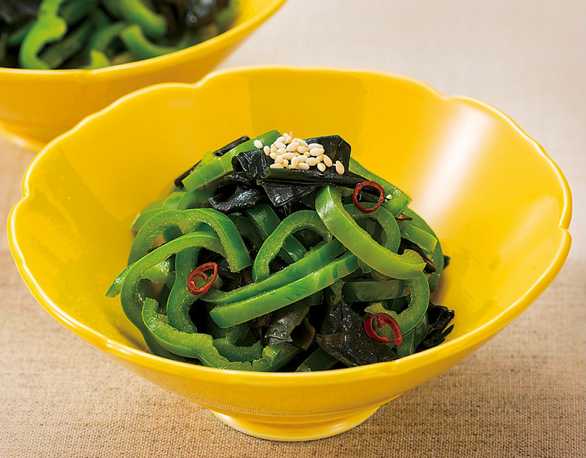 1) ピーマンは細切りに、わかめは水戻しして一口大に切る。