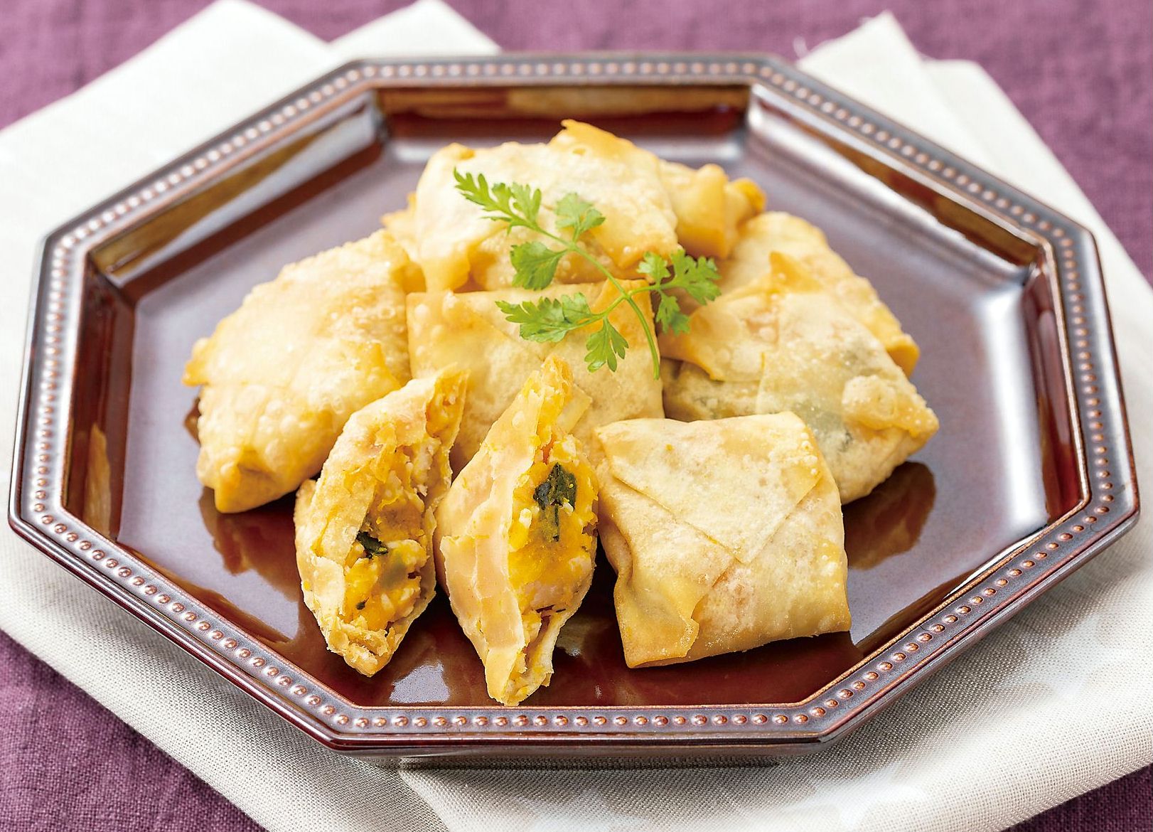鶏挽肉とかぼちゃのワンタン包み揚げ