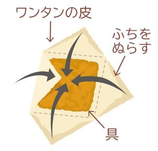 3)2)に1)を混ぜ合わせ、1さじずつワンタンの皮の中心にのせ、ふちに水をつけて包み、油で揚げる。