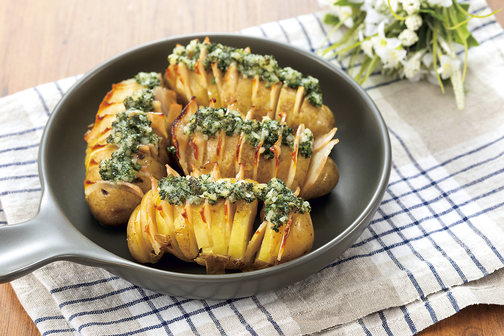 4)ベーコンを長さ3~4㎝に切り、じゃがいもの切れ目の間にはさむ。