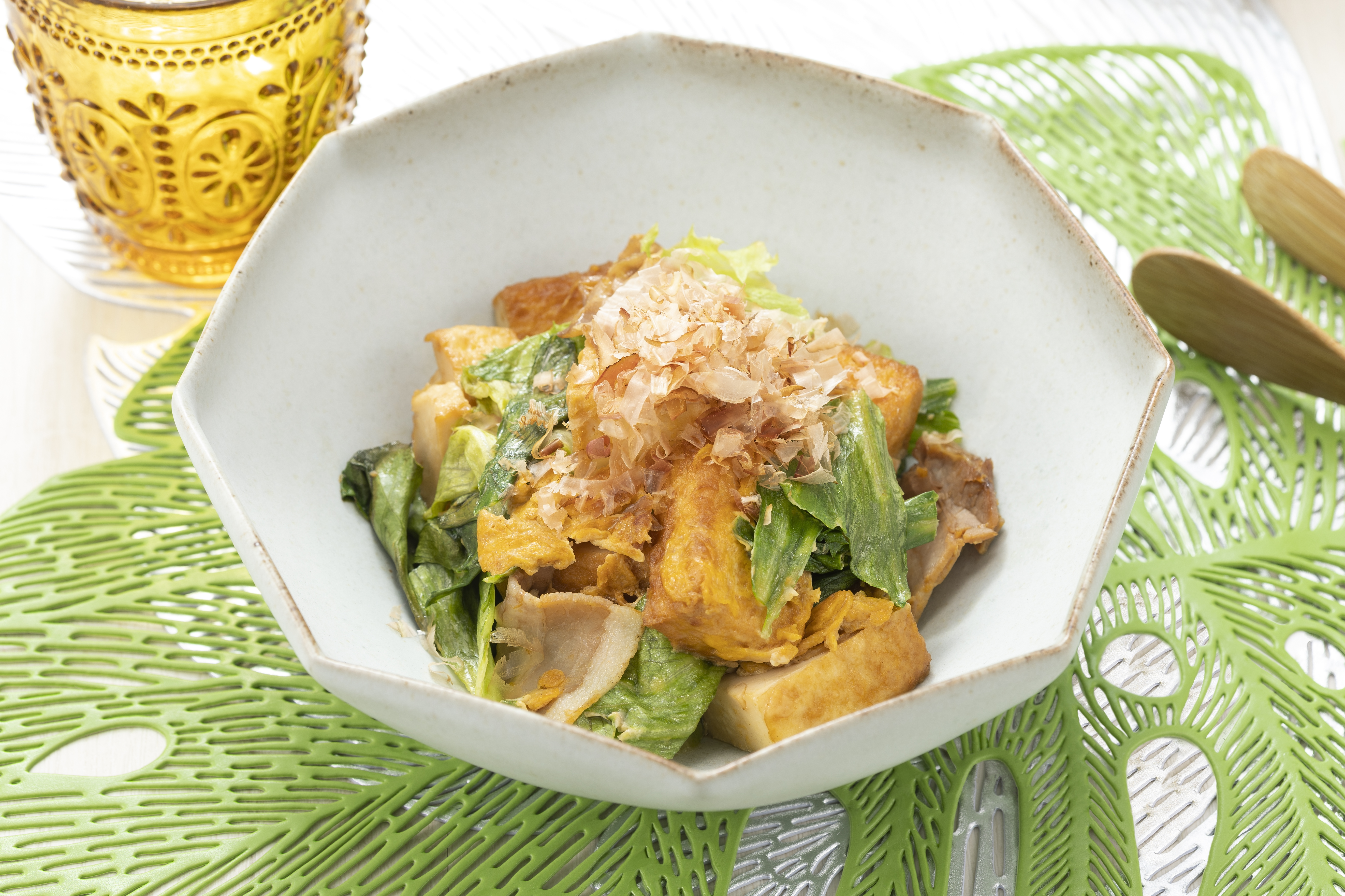 1) レタスは一口大に手でちぎる。ベーコンと厚揚げは、食べやすい大きさに切る。卵は割りほぐしておく。