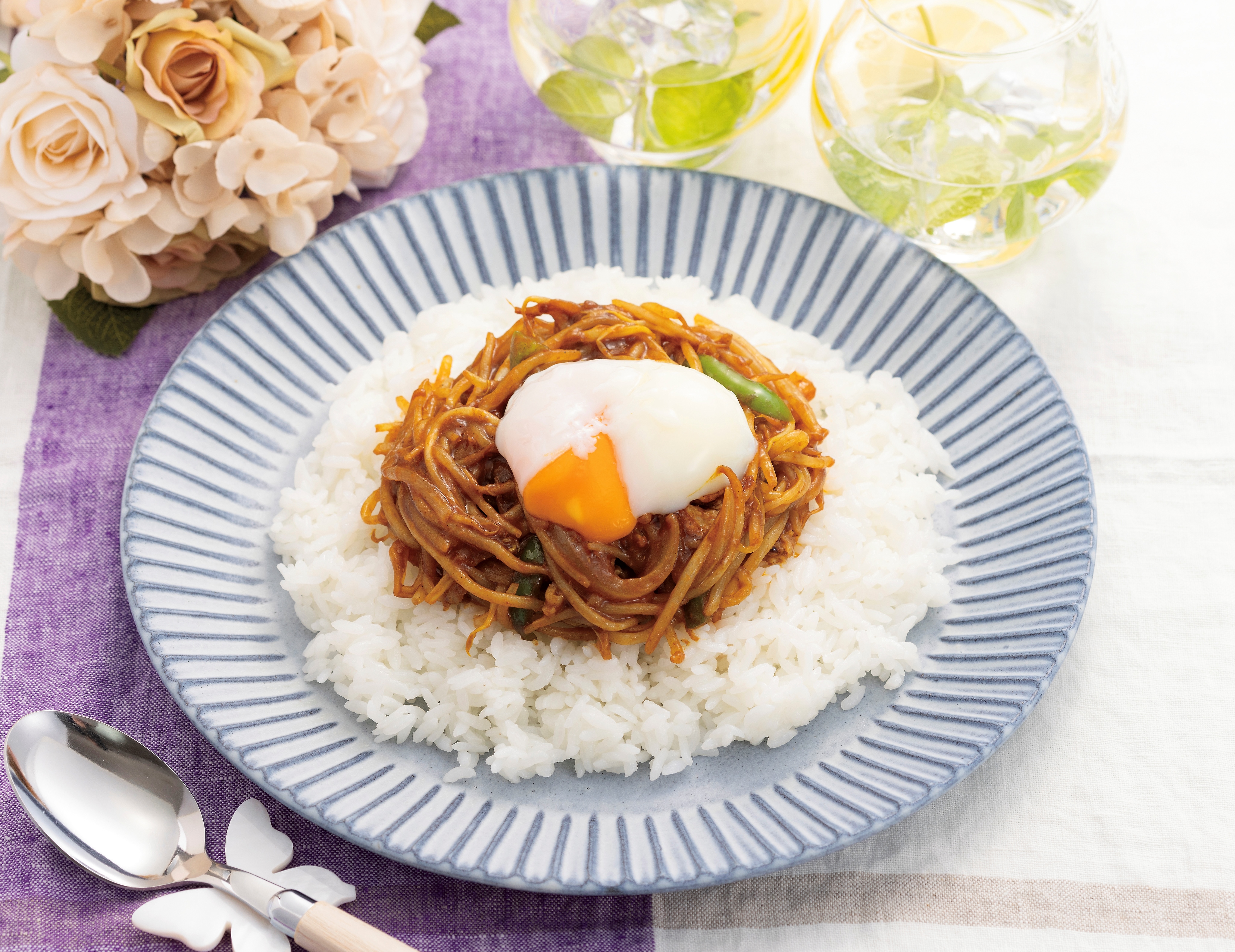 3)器に盛ったご飯に2)をのせ、温泉たまごを落とす。