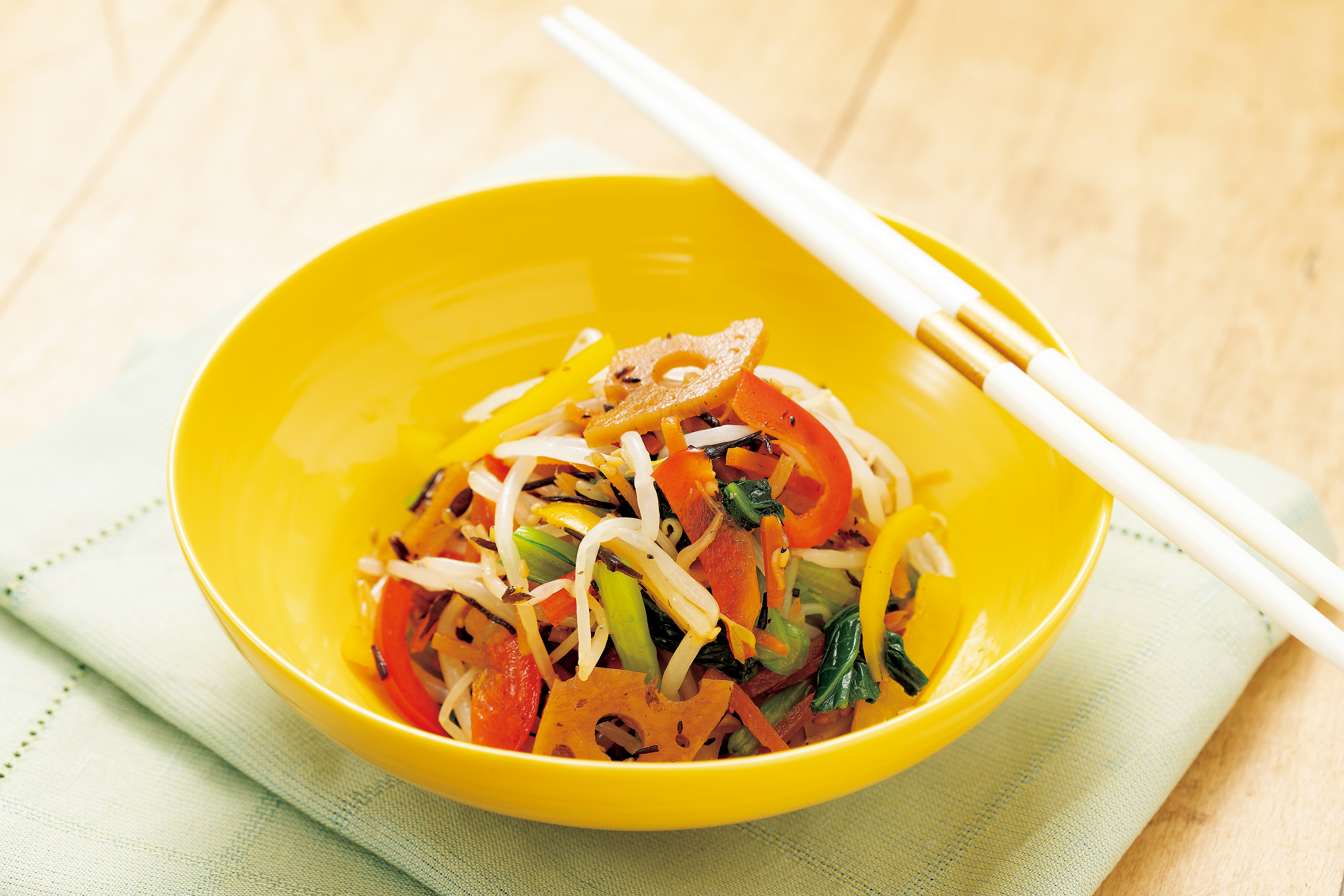 3)ボウルに1)、2)、コープシャキシャキ蓮根入り五目ごはんの素、ごま油を入れて和える。