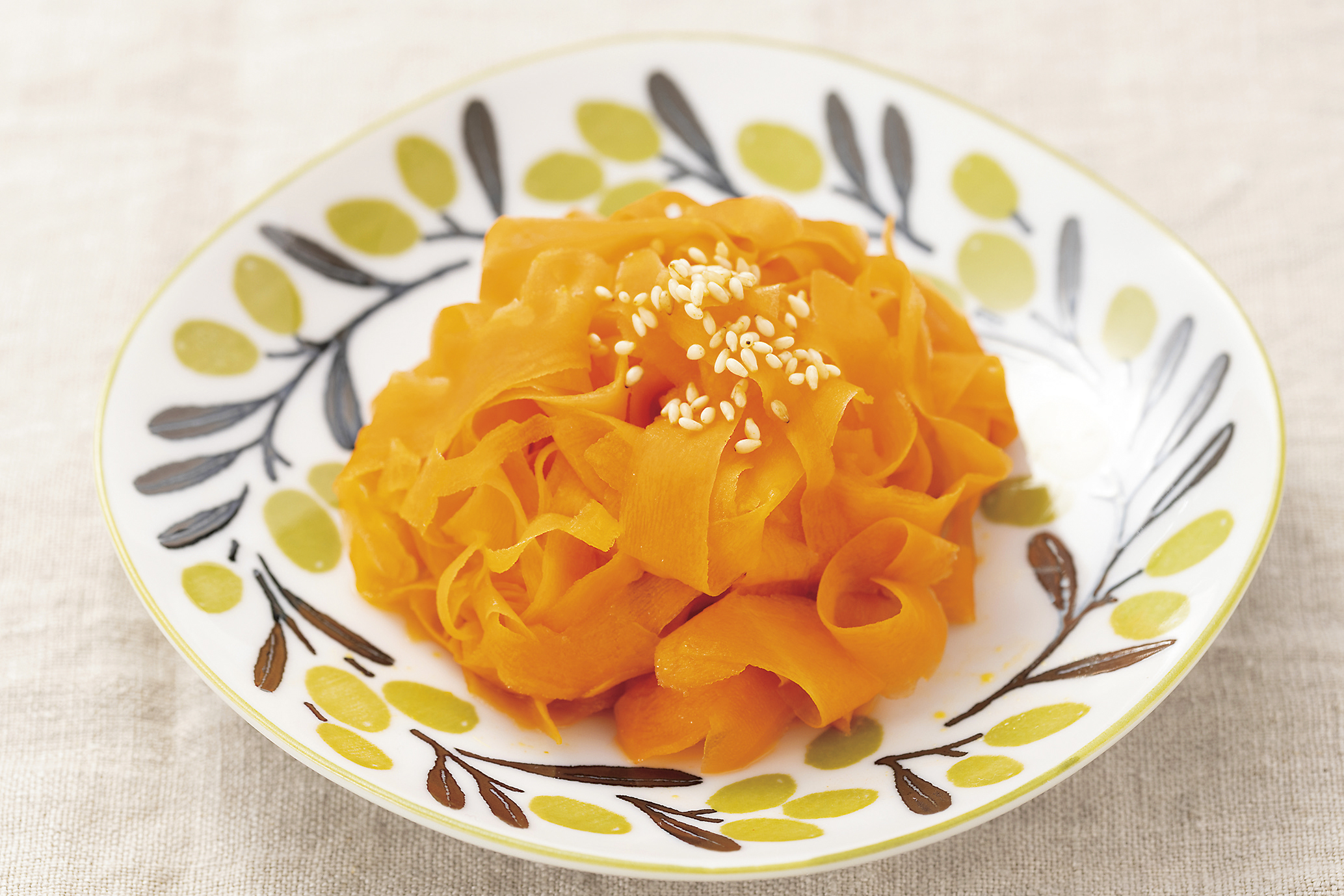 1)人参は皮をむき、ピーラーでスライスし、耐熱容器に入れる。