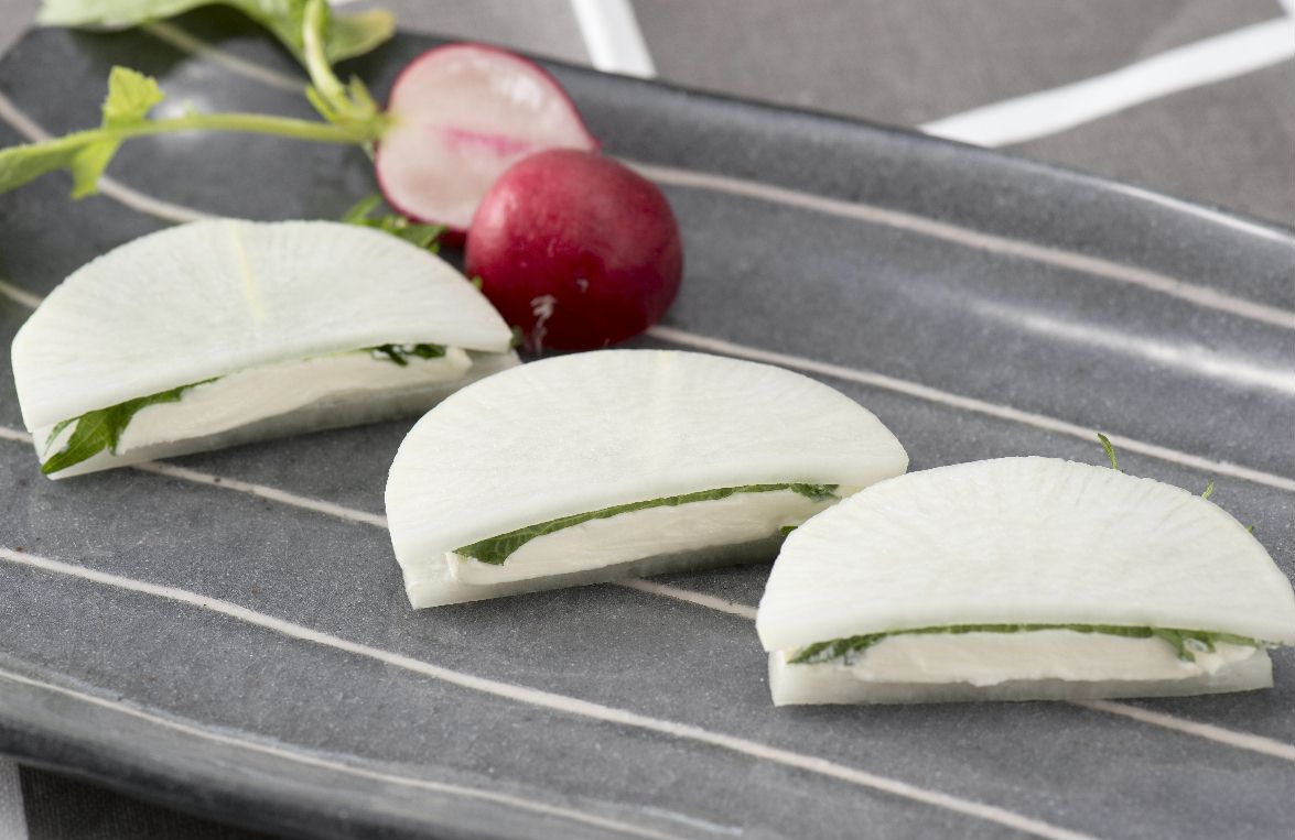 2)1)の大根1枚にクリームチーズをぬり、青じそをのせ、1)の大根をもう1枚のせてはさむ。