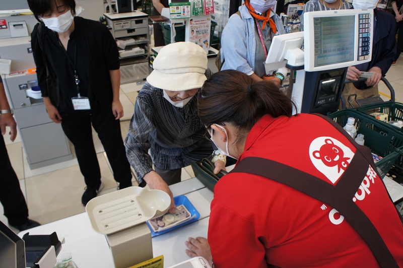 商品を選び終えたら専用レジ「ゆっくりレジ」へ向かいます。「ゆっくりレジ」では、レジ担当者が商品スキャンからお会計まで、ご利用者のペースに合わせて対応します。参加者はご自身のペースでゆっくりとレジを済ませました。