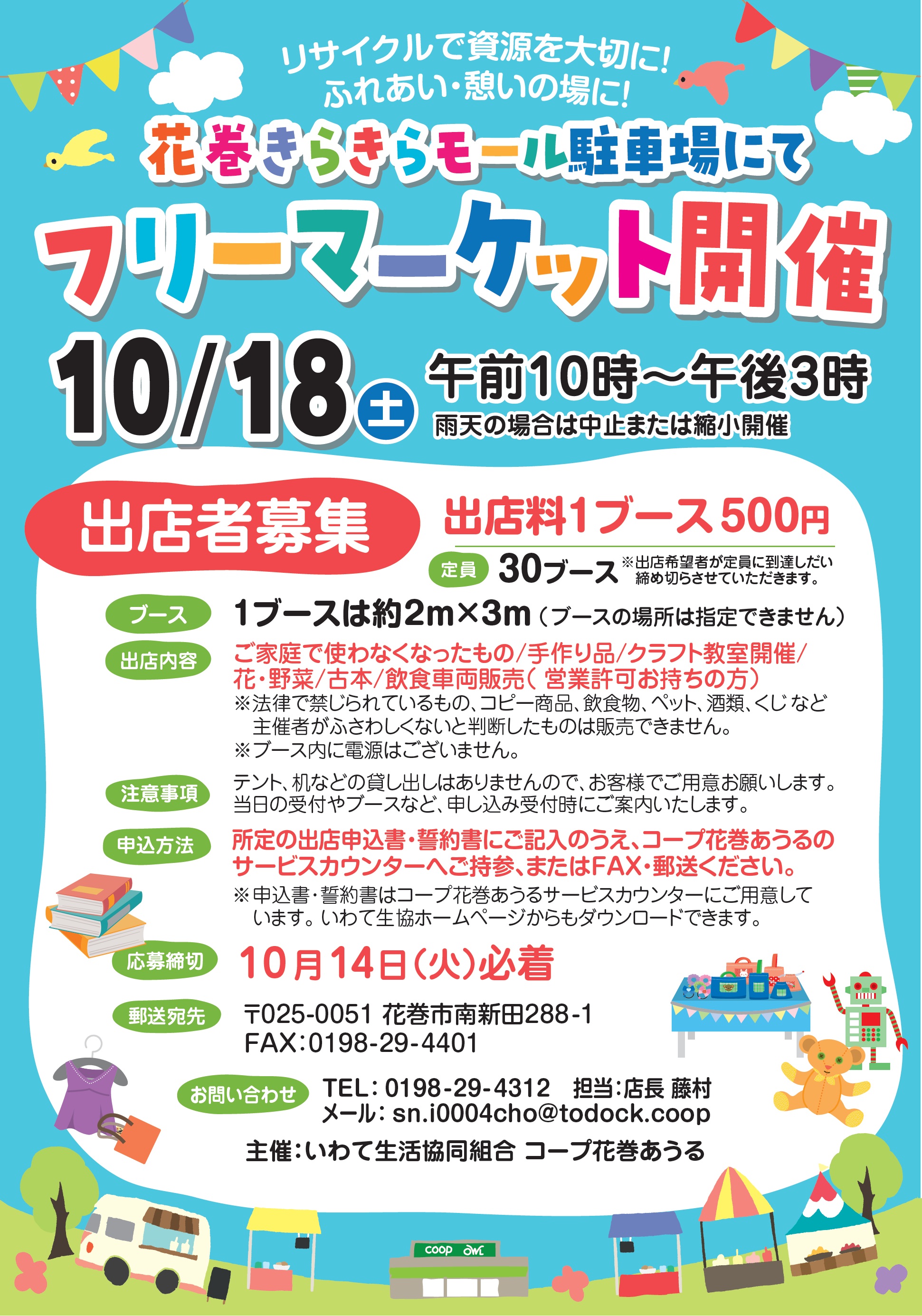 > 10/18(土)花巻きらきらモール駐車場にてフリーマーケット開催!出店者募集中