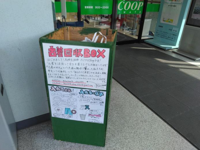 マリンコープドラでは、宮古市の高校生グループ「ハジメテShop」の取り組みを応援しようと古着回収ボックスを設置しています。集まった衣類は「ハジメテShop」が回収。団体への寄付やイベントでの利用が計画されています。